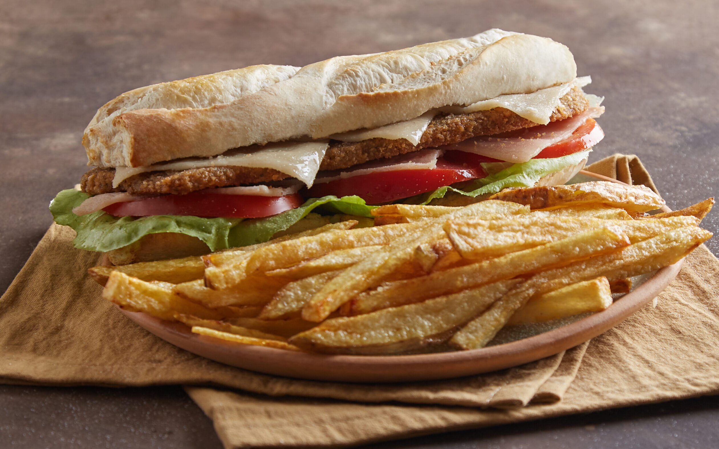 SANGUCHE DE MILANGA TRIPLE, LECHUGA, TOMATE, MAYO Y MOSTAZA.